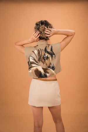 Featuring a stunning depiction of a horse on the back, this sleeveless design combines the sharpness of tailoring with the softness of art. The neutral tones make it versatile, while the intricate painting adds a bold, one-of-a-kind statement to your wardrobe.