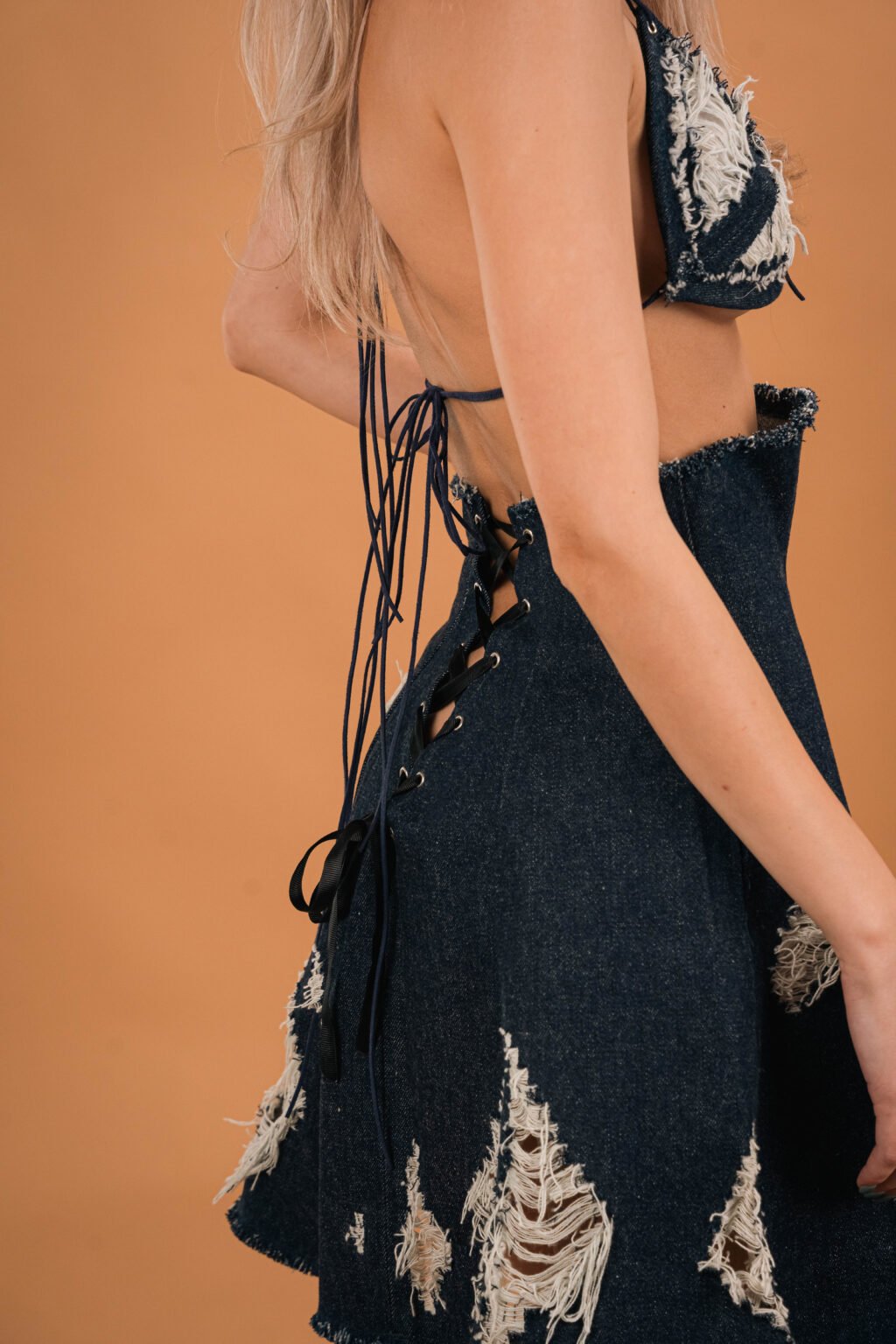 The Lace-up Denim Skirt is a modern twist on classic denim, featuring a high-waisted, flared silhouette with eye-catching distressed details. This edgy skirt has frayed accents and artfully placed distressed patches that add texture and a worn-in look.