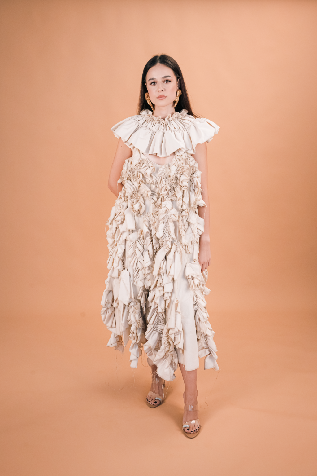Mid-length dress manufacturaed from natural beige cotton showcasing a deconstructed, organic aesthetic. With a flowing A-line cut that offers ease and movement and a high, ruffled neckline that adds a touch of avant-garde flair it is perfect for those seeking a modern, nature-inspired look.